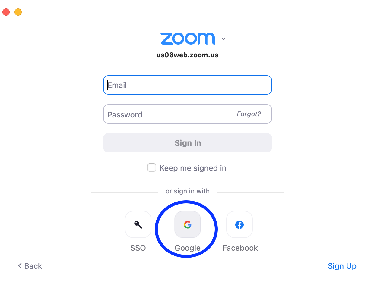 1. After opening Zoom, click on the Google icon.