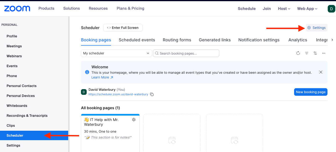 2. On the left side column, click "Scheduler". Then click "Settings" in the upper right corner.